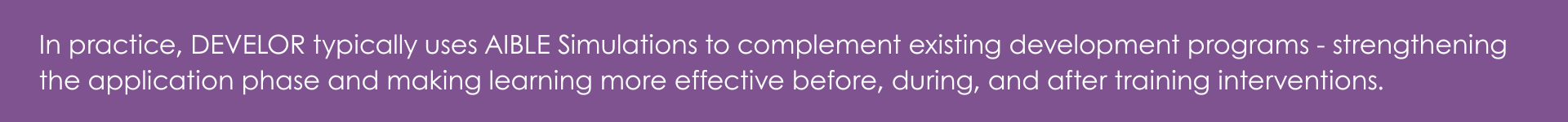 AIBLE Simulations is most effective when integrated into a broader development journey. At DEVELOR, we typically use it in three key phases: before training to assess readiness and highlight skill gaps, during training to create safe practice opportunities, and after training to reinforce and stabilize new behaviors. This ensures that learning does not remain a one-time event, but becomes an ongoing process connected to real work situations.