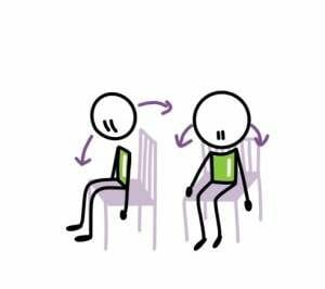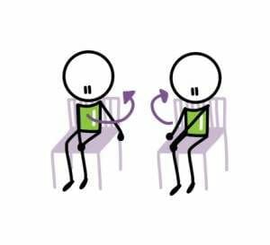 Place your left hand on your right knee and hold on to the back of the chair with your right hand (or hug the backrest of the chair)